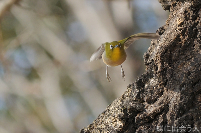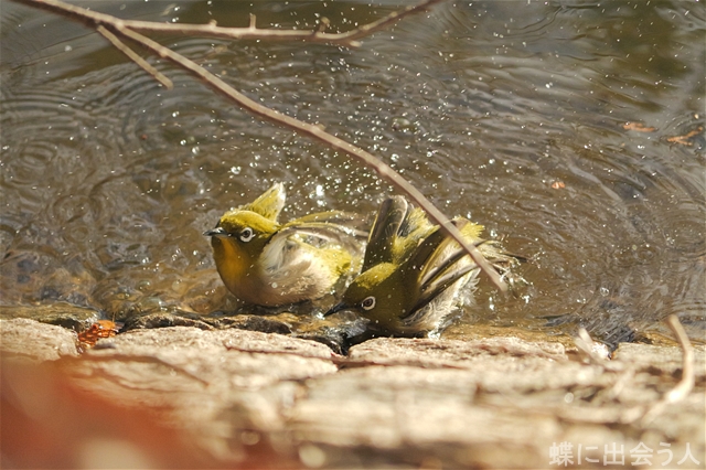 メジロたちの水浴びポイントに行ってみると、数羽の群れが入れ替わり立ち替わり水浴びに来ていました。