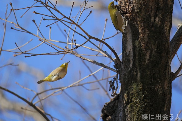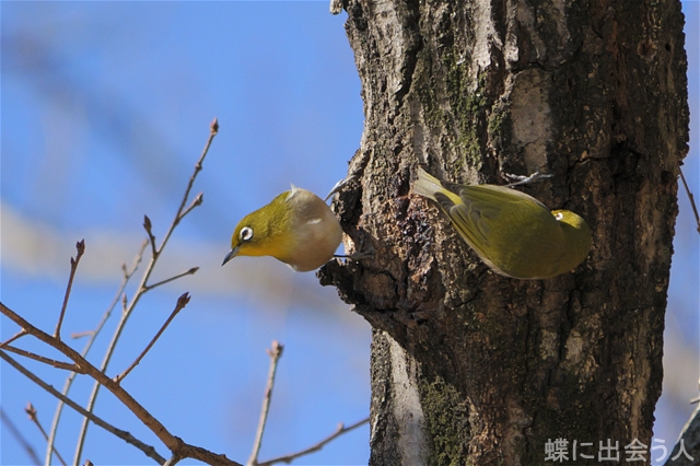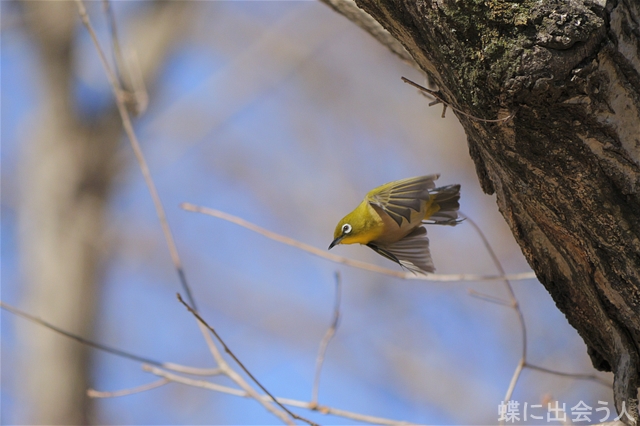 メジロは何カ所かある樹液のポイントを順番に回るので、あらかじめ飛ぶコースを予想してピントを合わせておき、飛び立ったらシャッターを切ります。